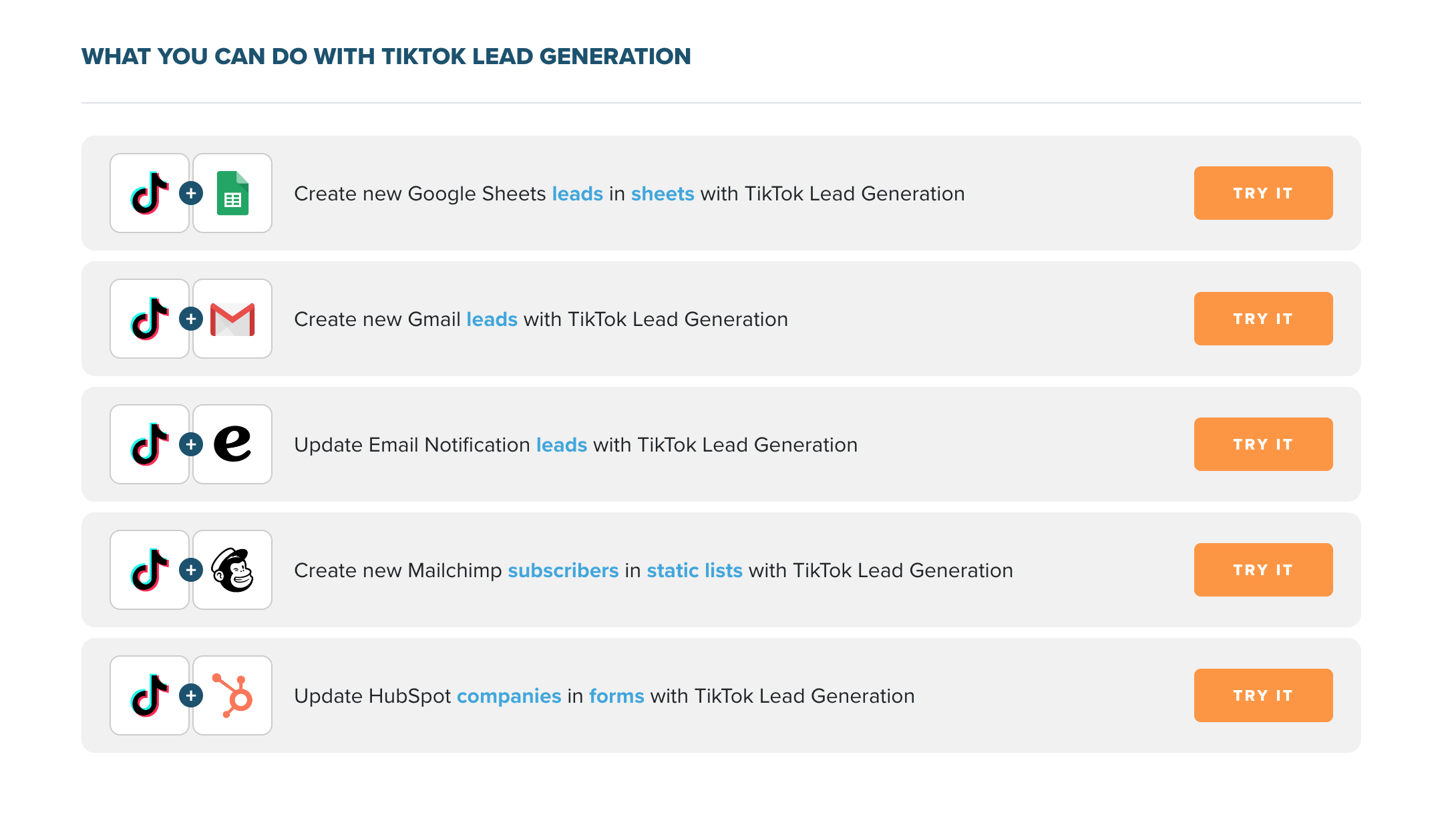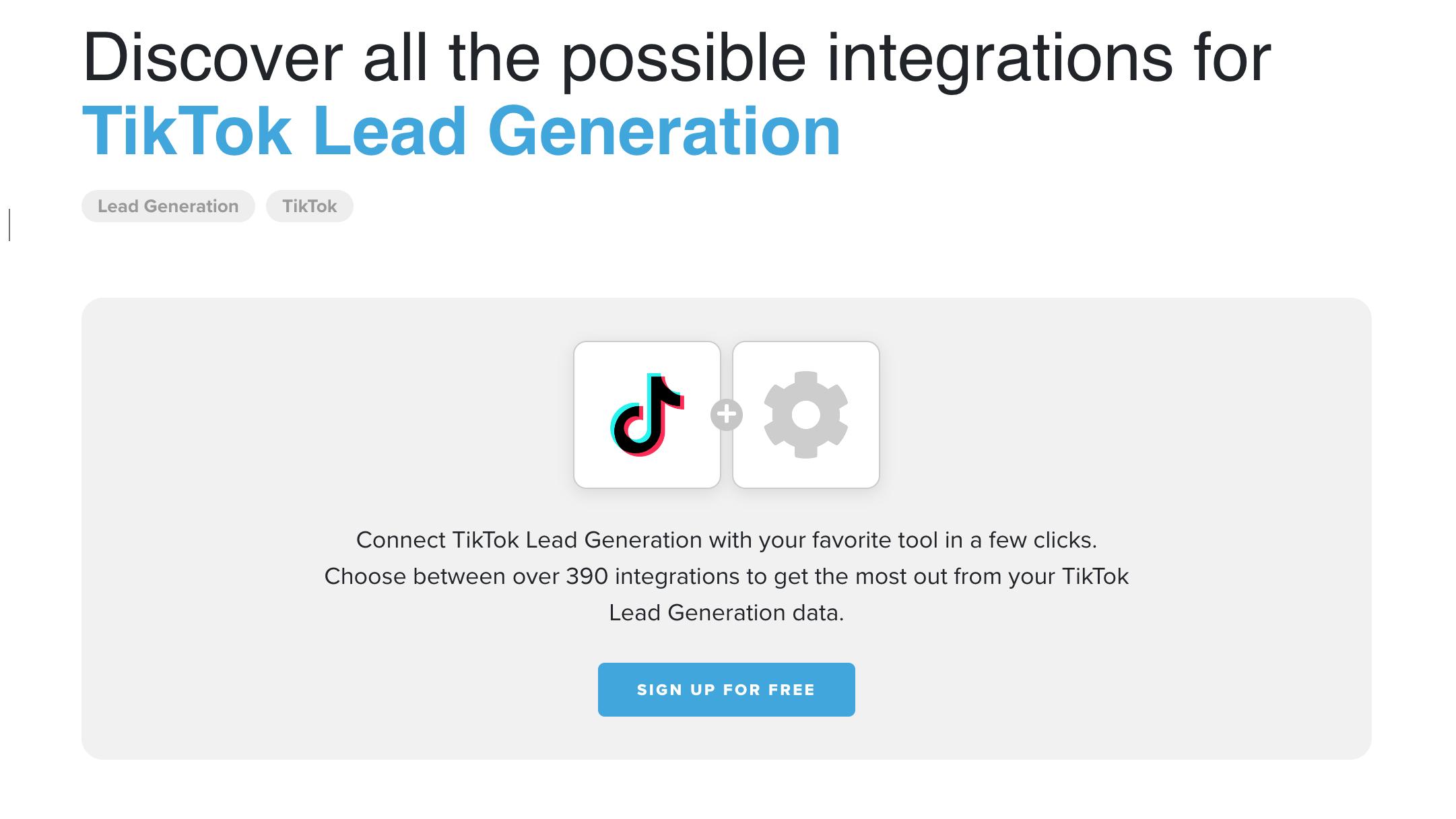 Connect TikTok Lead Generation with your favorite tool in a few clicks. Choose between over 390 integrations to get the most out from your TikTok Lead Generation data.